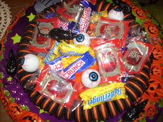 I just love Fall and all that it evokes. Now granted, I am not into the satanist undertone that Halloween can bring with it, but I admit, I do love the candy and some of the decorations. So when I made a trip to Dollar General, I couldn't pass on picking up some goodies to make a treat tray for my sweetie to take to work. The rubber rats, squirting eyeballs and glow in the dark fangs that you fill with candy 'blood' are my favorite!!